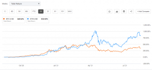 Ether’s cost expanded more than nine-crease in the previous year versus Bitcoin’s four-overlay ascend as found in the outline underneath.